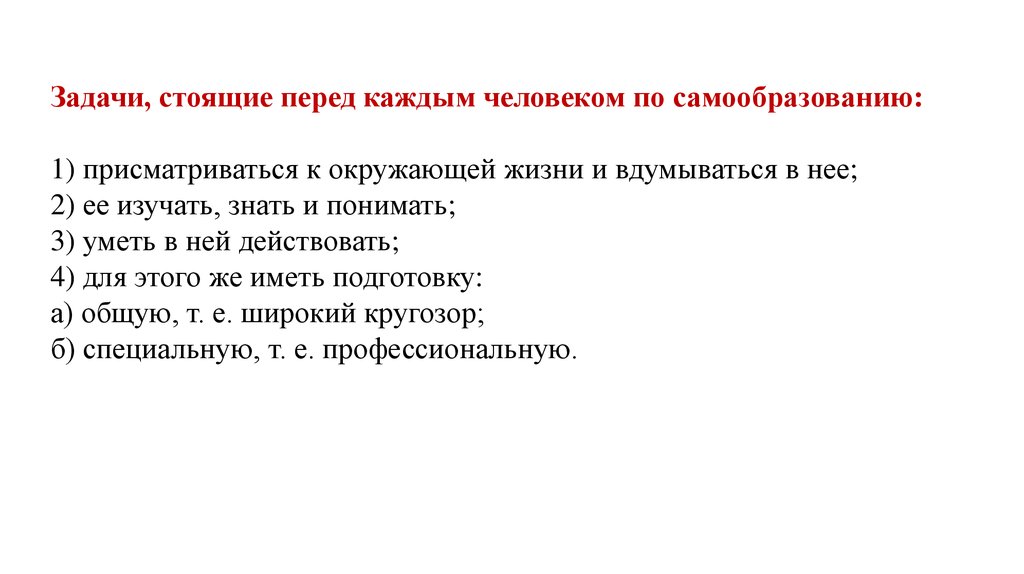 Задачи, стоящие перед каждым человеком по самообразованию:1) присматриваться к окружающей жизни и вдумываться в нее;