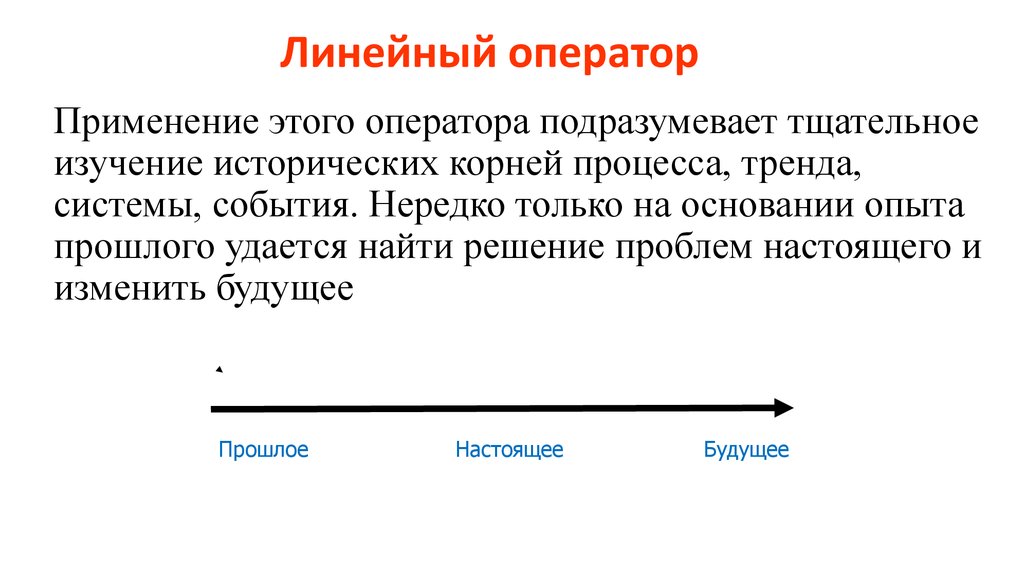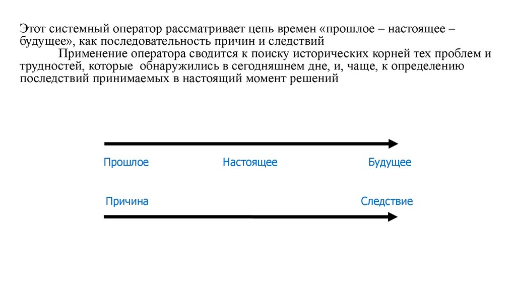 Этот системный оператор рассматривает цепь времен «прошлое – настоящее –будущее», как последовательность причин и следствий