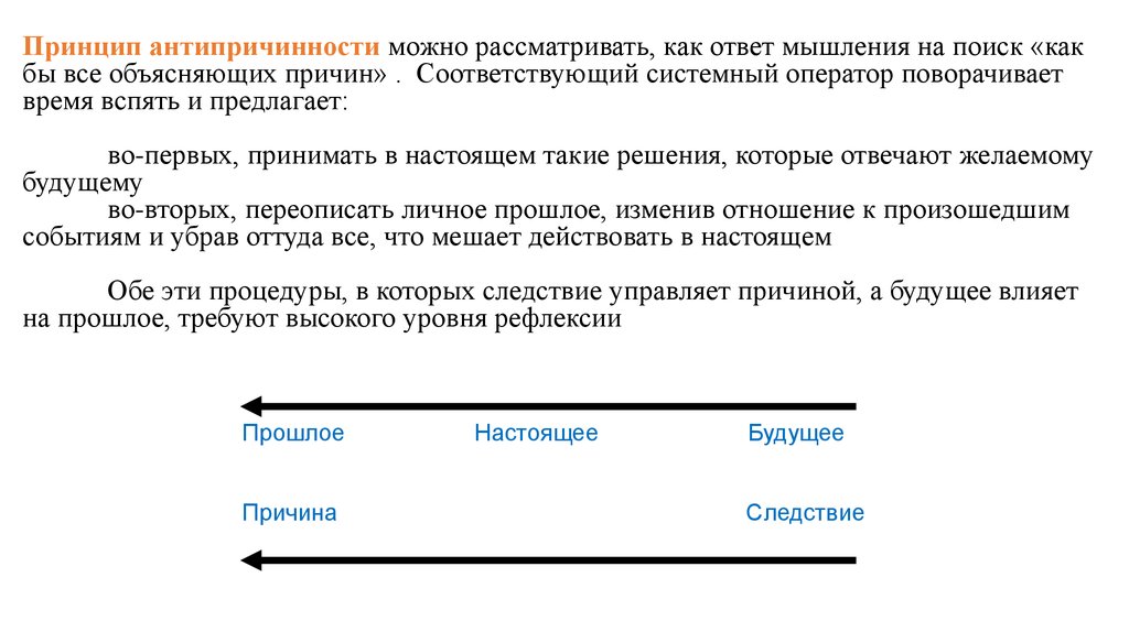 Принцип антипричинности можно рассматривать, как ответ мышления на поиск «какбы все объясняющих причин» . Соответствующий системный оператор поворачивает