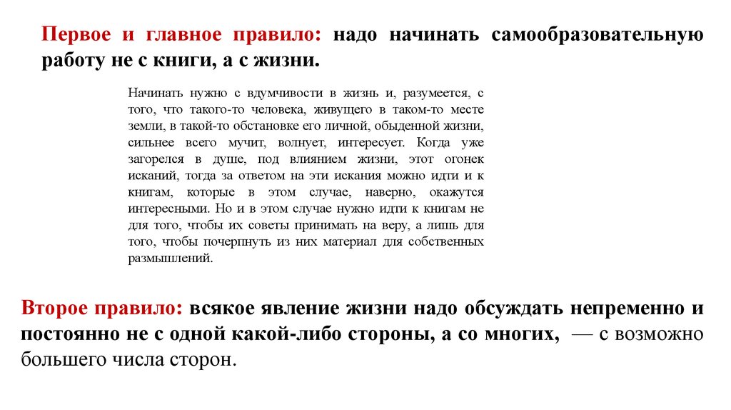 Первое и главное правило: надо начинать самообразовательнуюработу не с книги, а с жизни.
