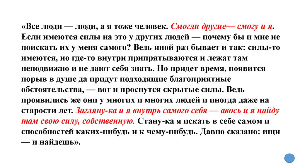 «Все люди — люди, а я тоже человек. Смогли другие— смогу и я.Если имеются силы на это у других людей — почему бы и мне не