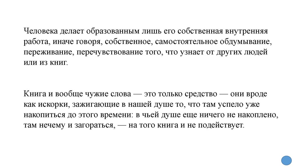 Человека делает образованным лишь его собственная внутренняяработа, иначе говоря, собственное, самостоятельное обдумывание,