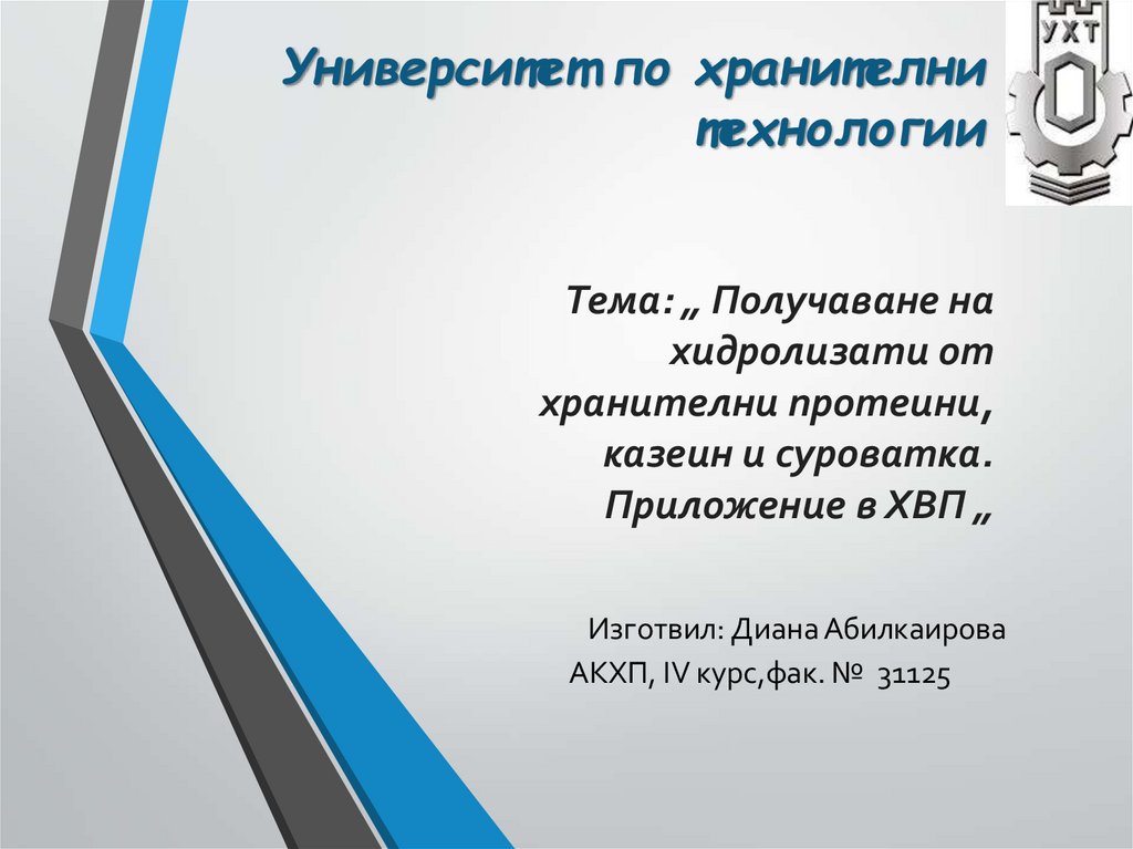 1. Тема: „ Получаване на хидролизати от хранителни протеини, казеин и суроватка. Приложение в ХВП „