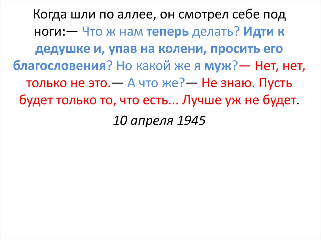 Когда шли по аллее, он смотрел себе подноги:— Что ж нам теперь делать? Идти к