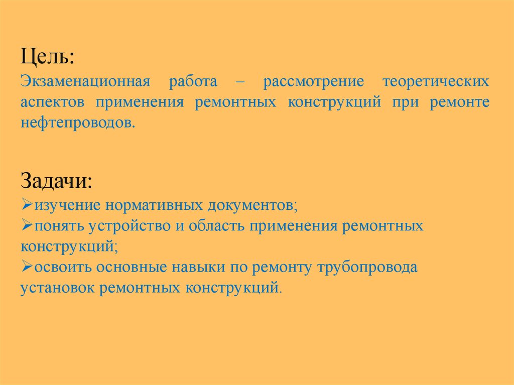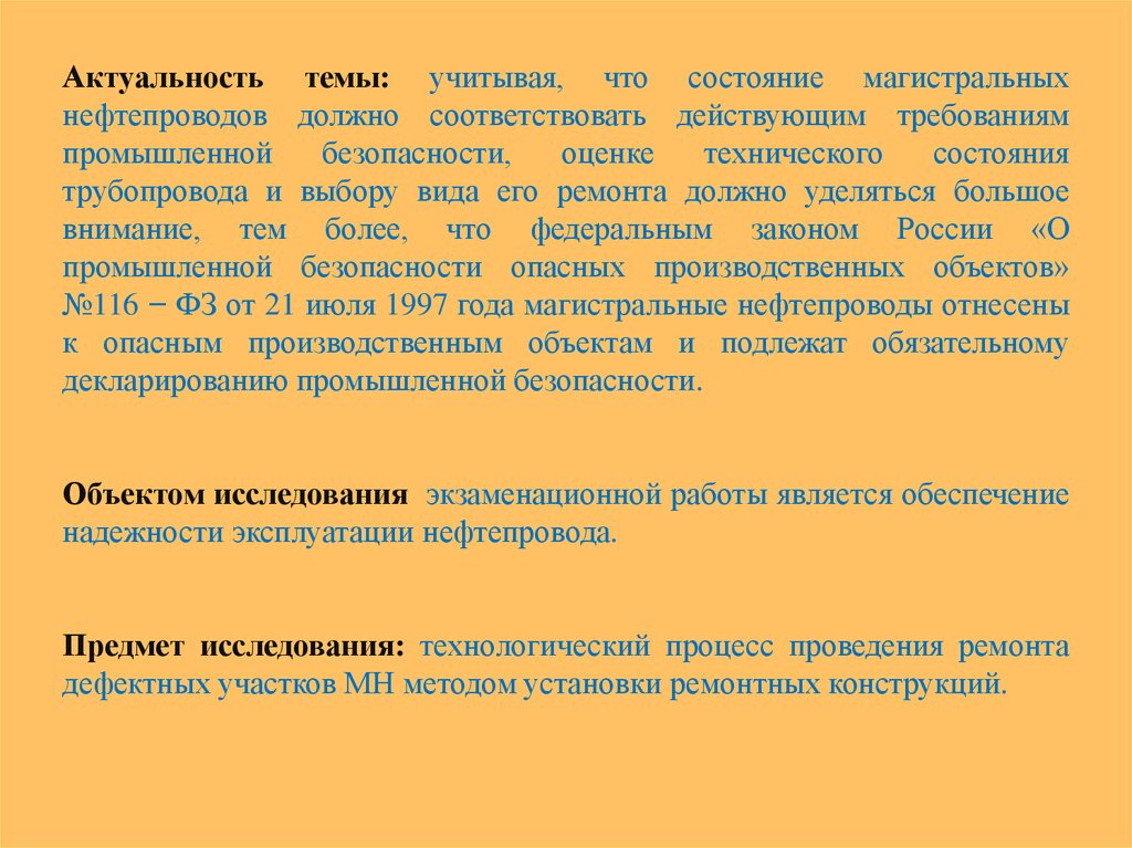 Актуальность темы: учитывая, что состояние магистральныхнефтепроводов должно соответствовать действующим требованиям
