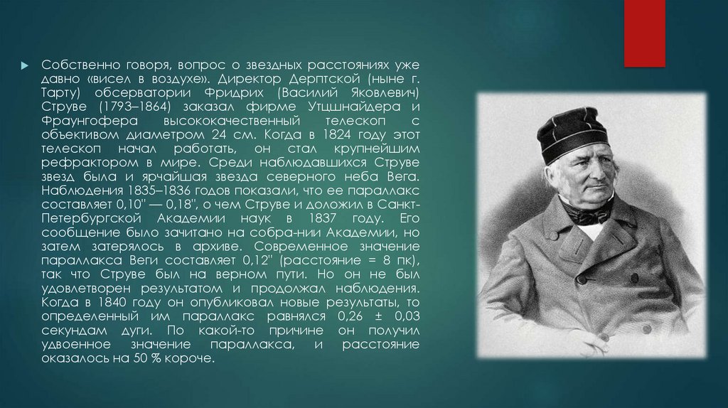Собственно говоря, вопрос о звездных расстояниях ужедавно «висел в воздухе». Директор Дерптской (ныне г.