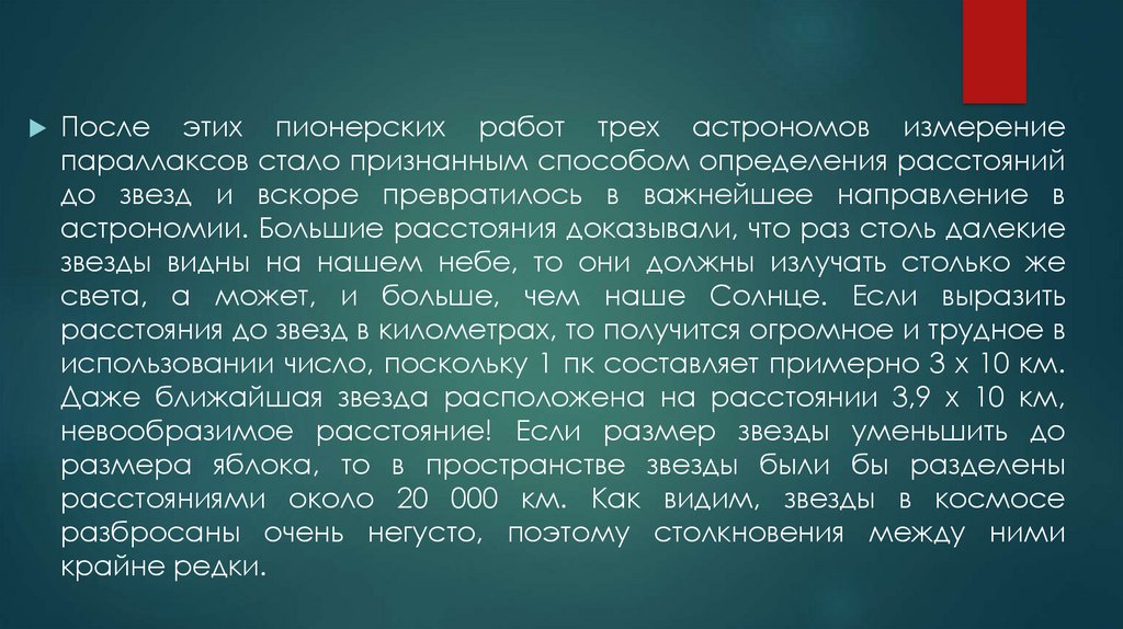 После этих пионерских работ трех астрономов измерениепараллаксов стало признанным способом определения расстояний
