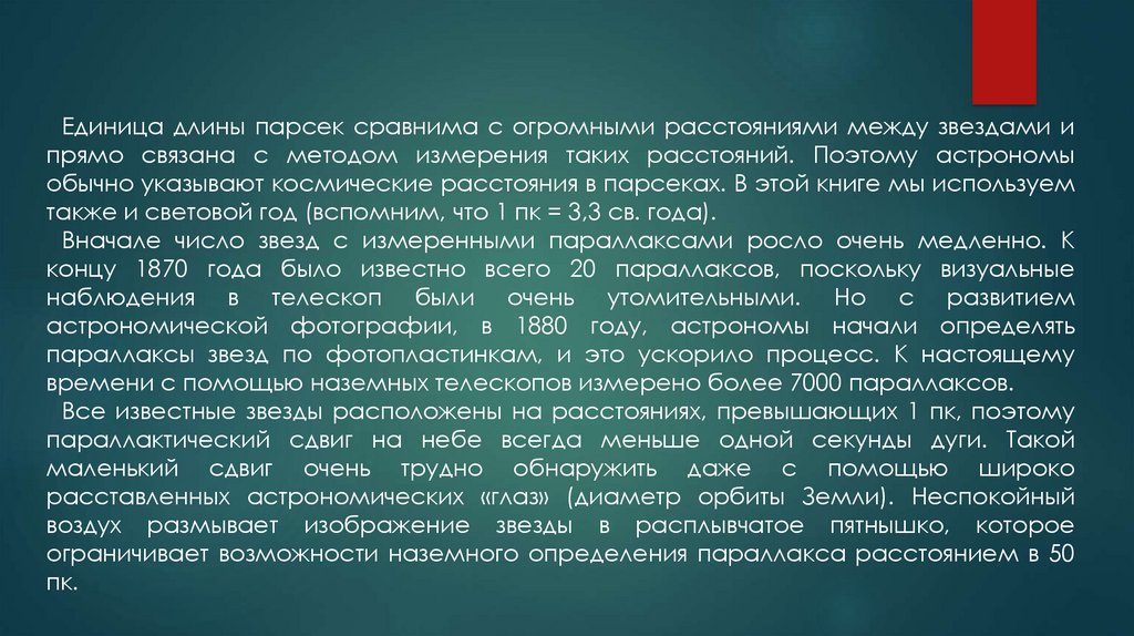 Единица длины парсек сравнима с огромными расстояниями между звездами ипрямо связана с методом измерения таких расстояний. Поэтому астрономы