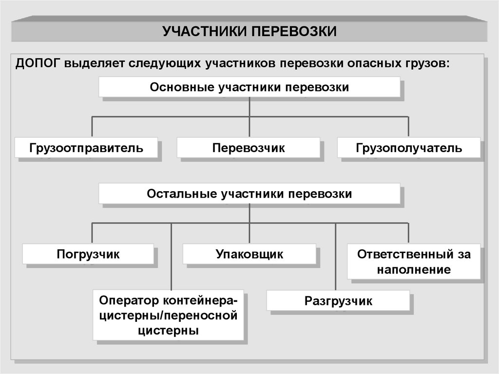 УЧАСТНИКИ ПЕРЕВОЗКИДОПОГ выделяет следующих участников перевозки опасных грузов:
