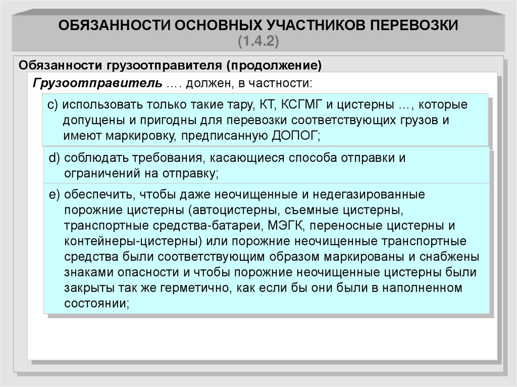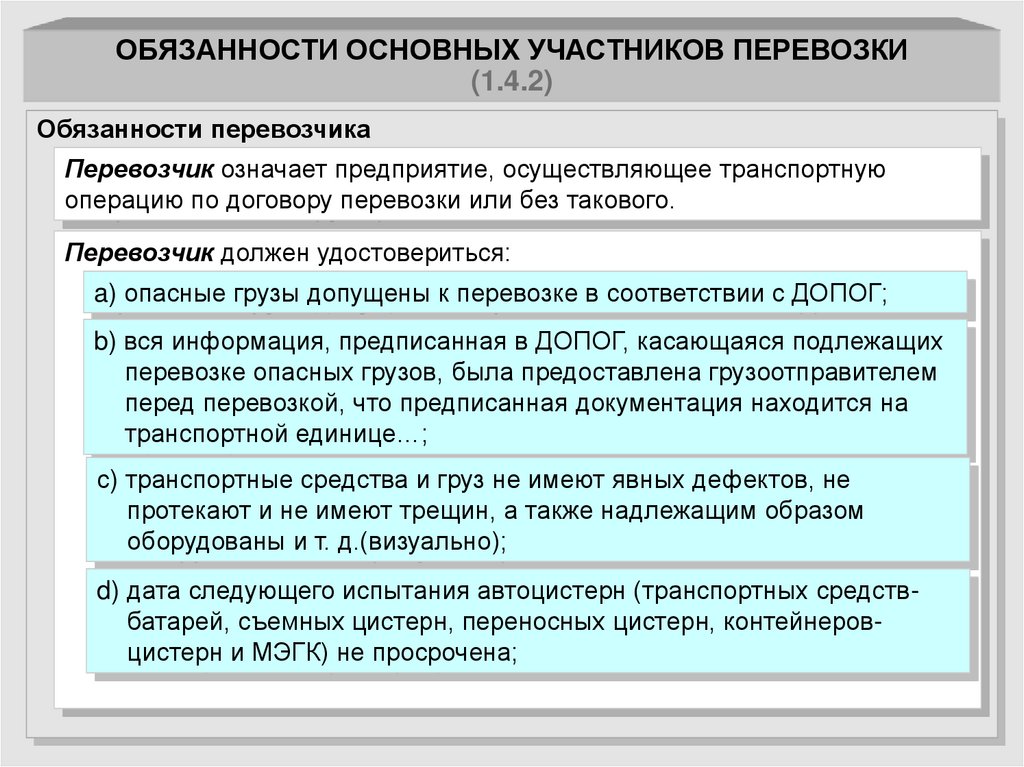 ОБЯЗАННОСТИ ОСНОВНЫХ УЧАСТНИКОВ ПЕРЕВОЗКИ(1.4.2)