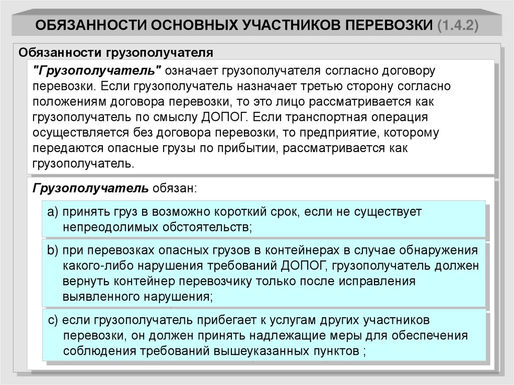 ОБЯЗАННОСТИ ОСНОВНЫХ УЧАСТНИКОВ ПЕРЕВОЗКИ (1.4.2)Обязанности грузополучателя