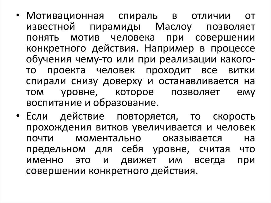 • Мотивационная спираль в отличии отизвестной пирамиды Маслоу позволяет