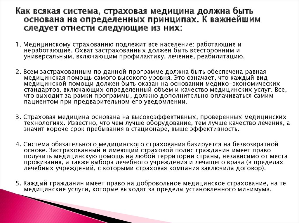Как всякая система, страховая медицина должна бытьоснована на определенных принципах. К важнейшим