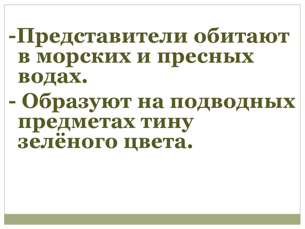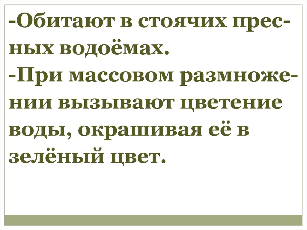 -Обитают в стоячих пресных водоёмах.-При массовом размножении вызывают цветение