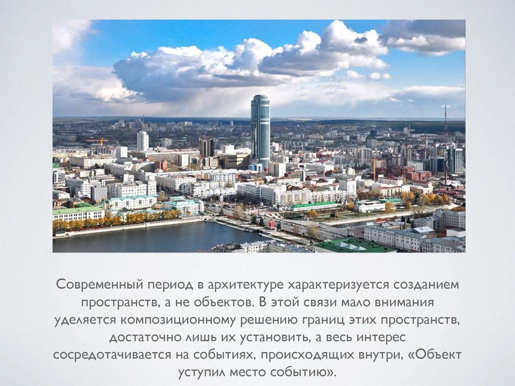 Современный период в архитектуре характеризуется созданиемпространств, а не объектов. В этой связи мало внимания