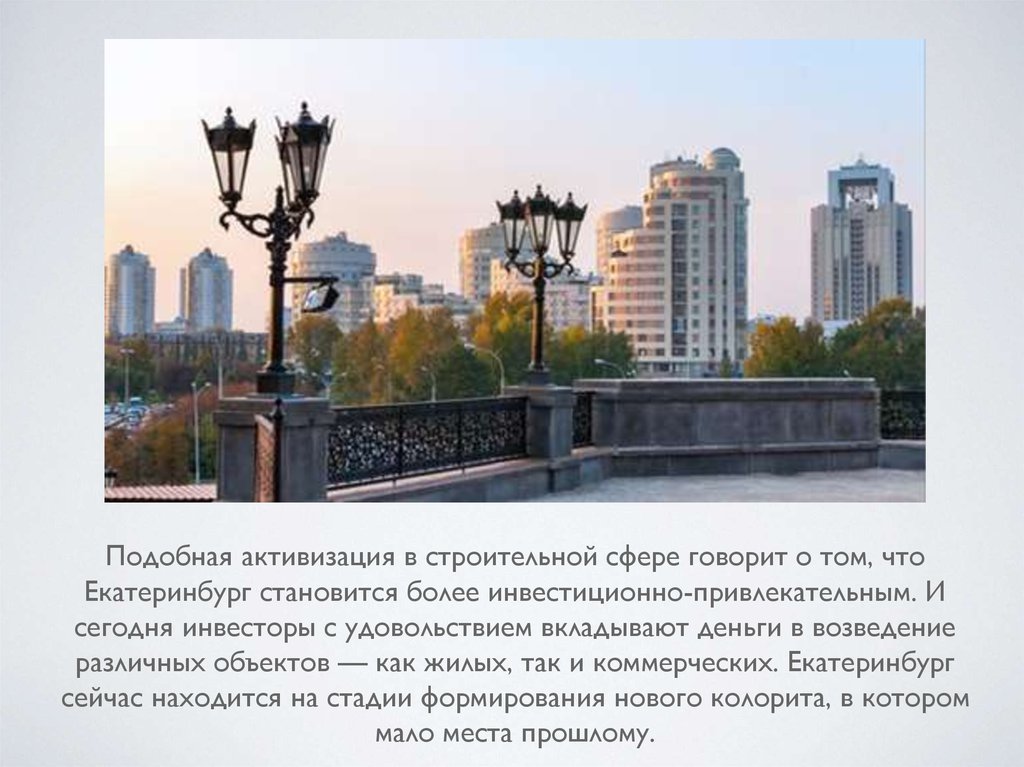Подобная активизация в строительной сфере говорит о том, чтоЕкатеринбург становится более инвестиционно-привлекательным. И