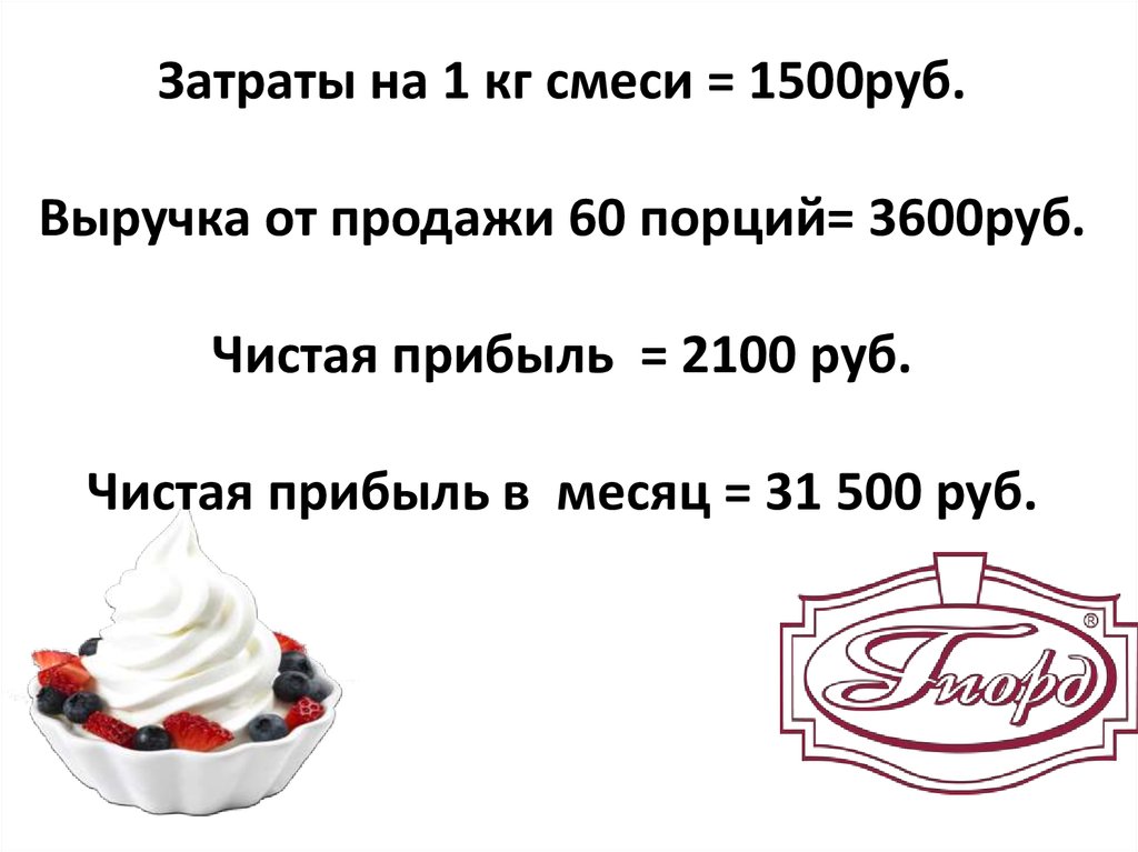Затраты на 1 кг смеси = 1500руб.Выручка от продажи 60 порций= 3600руб.