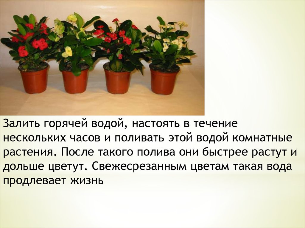 Залить горячей водой, настоять в течениенескольких часов и поливать этой водой комнатные