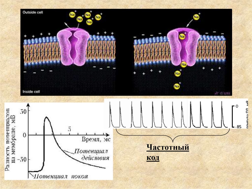 Схема распределения зарядов по разные стороны мембранывозбудимой клетки в спокойном состоянии и при возникновении