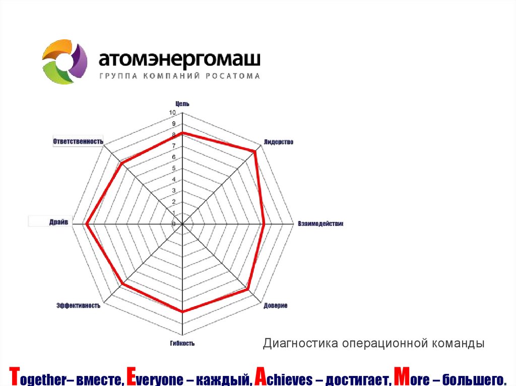 Диагностика операционной командыTogether– вместе, Everyone – каждый, Achieves – достигает, More – большего.