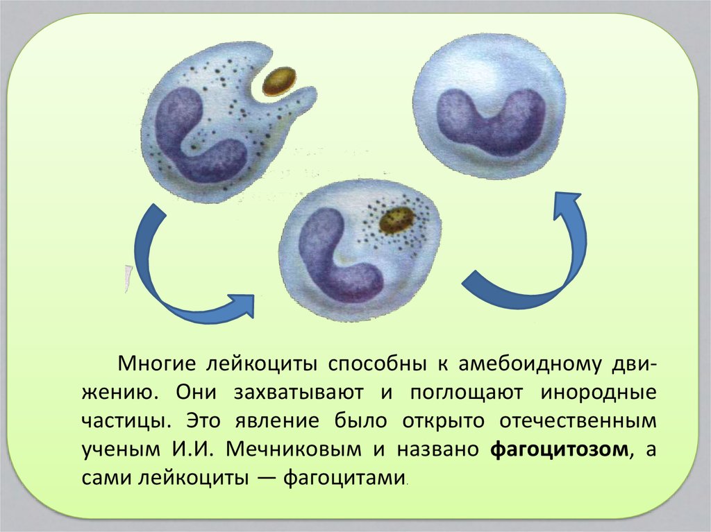 Многие лейкоциты способны к амебоидному движению. Они захватывают и поглощают инородныечастицы. Это явление было открыто отечественным