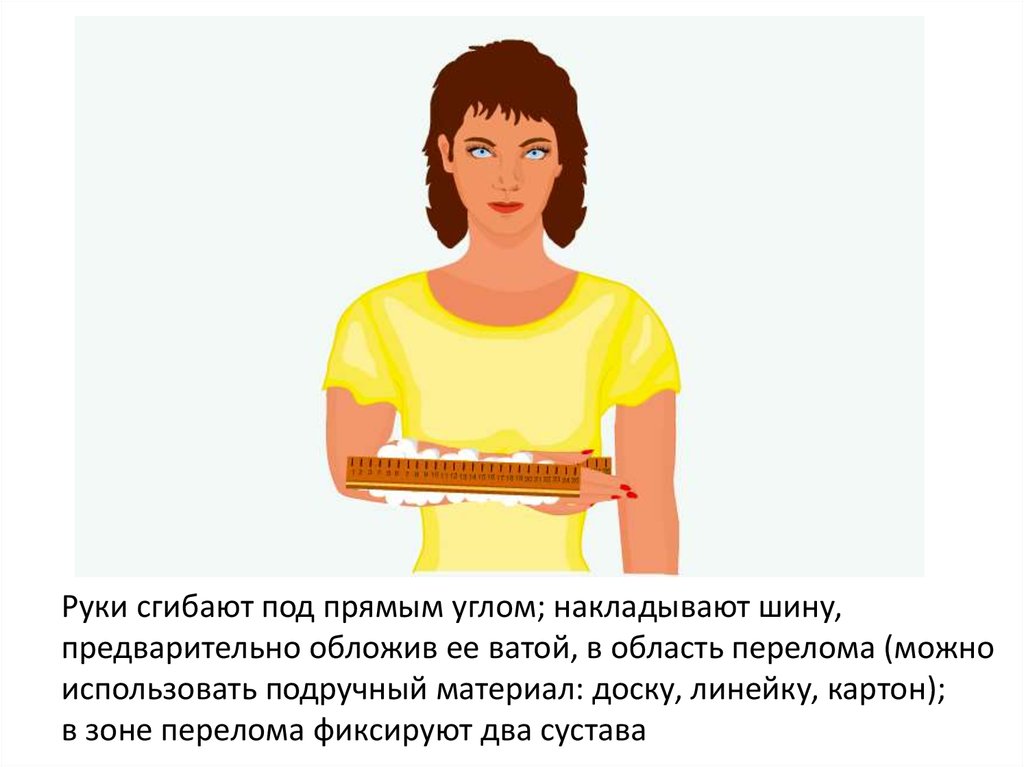Руки сгибают под прямым углом; накладывают шину,предварительно обложив ее ватой, в область перелома (можно