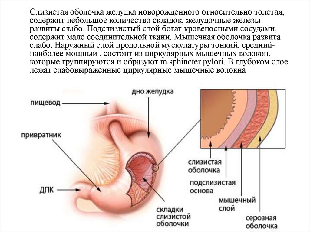 Слизистая оболочка желудка новорожденного относительно толстая,содержит небольшое количество складок, желудочные железы