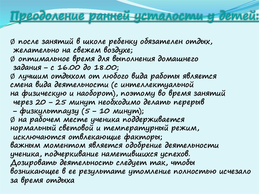 Преодоление ранней усталости у детей:Ø после занятий в школе ребенку обязателен отдых,