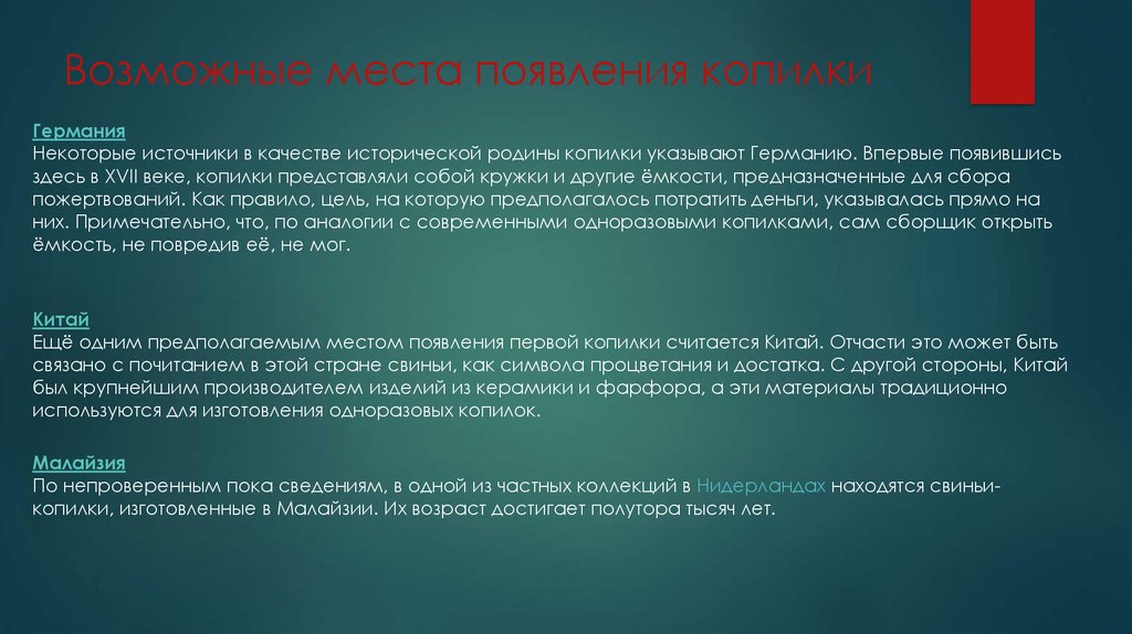 Некоторые источники в качестве исторической родины копилки указывают Германию. Впервые появившись