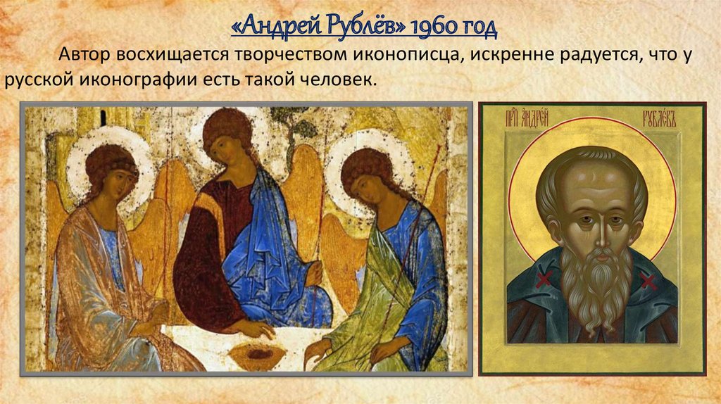 «Андрей Рублёв» 1960 годАвтор восхищается творчеством иконописца, искренне радуется, что у