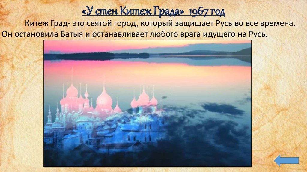 «У стен Китеж Града» 1967 годКитеж Град- это святой город, который защищает Русь во все времена.