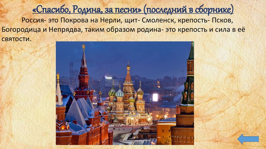 «Спасибо, Родина, за песни» (последний в сборнике)Россия- это Покрова на Нерли, щит- Смоленск, крепость- Псков,