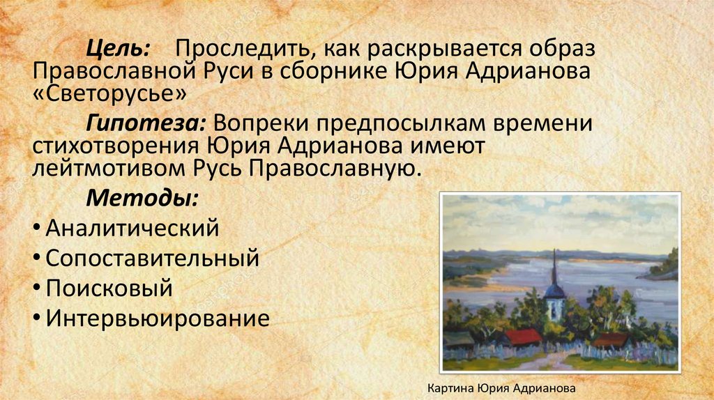Цель: Проследить, как раскрывается образПравославной Руси в сборнике Юрия Адрианова
