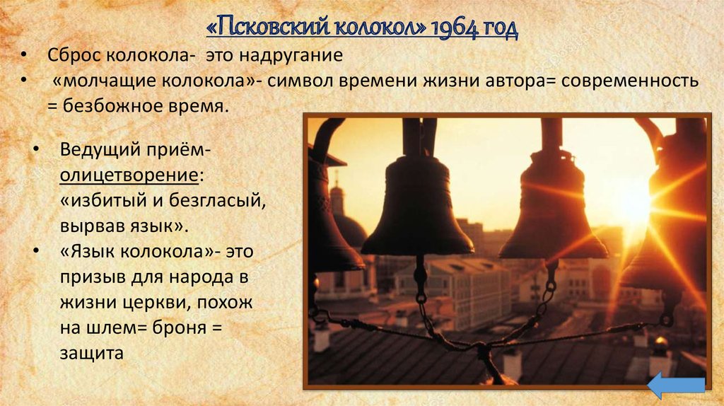 • «молчащие колокола»- символ времени жизни автора= современность