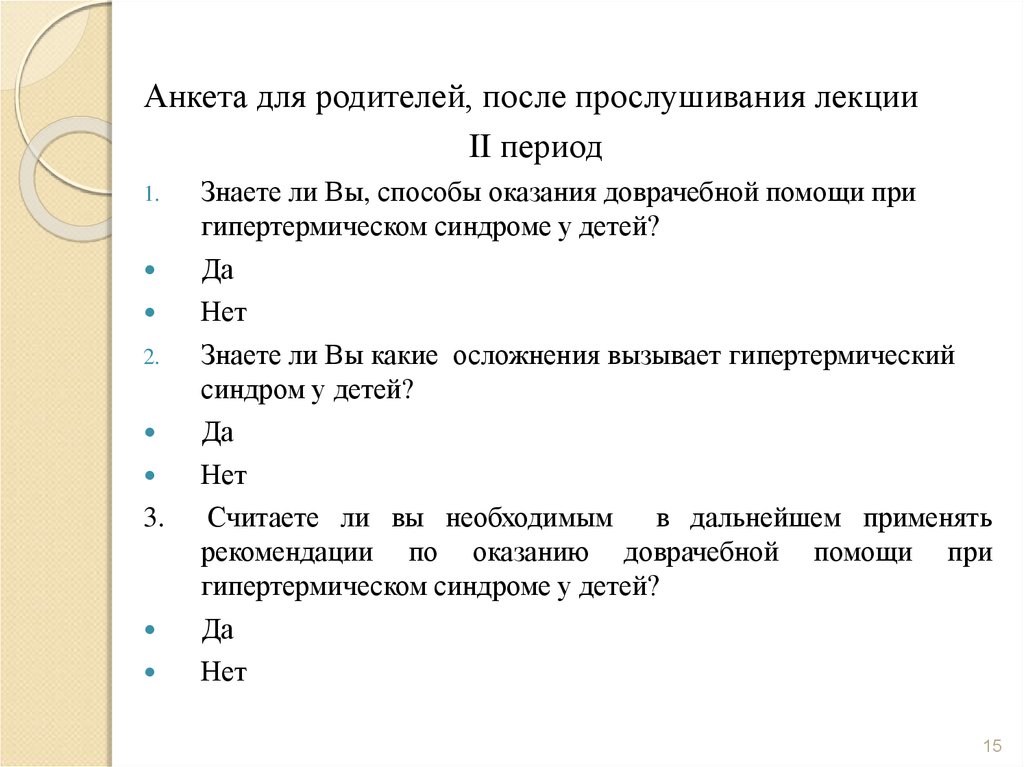 14. Анкетирование Анкета для родителей ,до прослушивания лекции I период