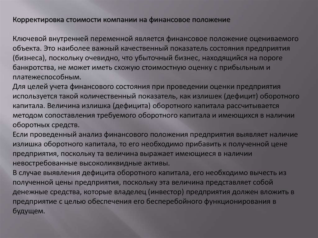 Корректировка стоимости компании на финансовое положениеКлючевой внутренней переменной является финансовое положение оцениваемого