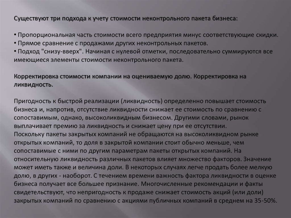 Существуют три подхода к учету стоимости неконтрольного пакета бизнеса:• Пропорциональная часть стоимости всего предприятия минус соответствующие скидки.