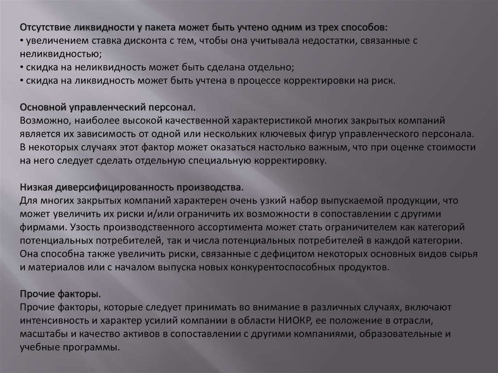 Отсутствие ликвидности у пакета может быть учтено одним из трех способов:• увеличением ставка дисконта с тем, чтобы она учитывала недостатки, связанные с