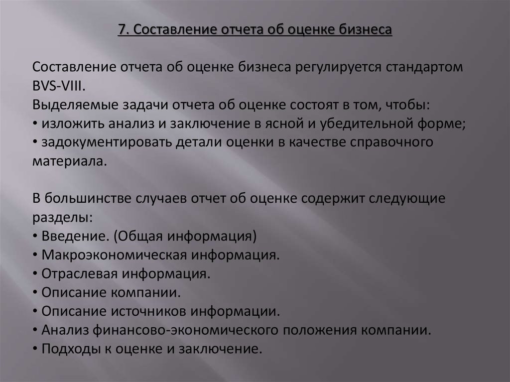 7. Составление отчета об оценке бизнесаСоставление отчета об оценке бизнеса регулируется стандартом