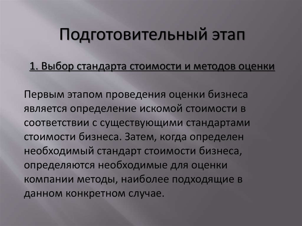 Подготовительный этап1. Выбор стандарта стоимости и методов оценки