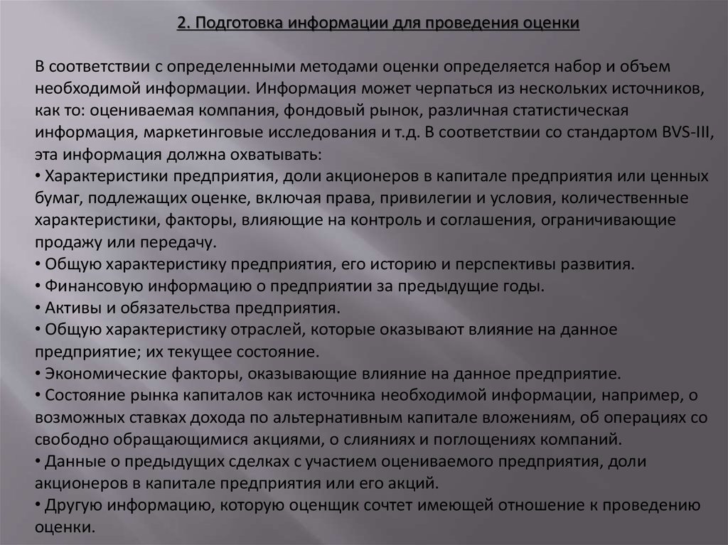 2. Подготовка информации для проведения оценкиВ соответствии с определенными методами оценки определяется набор и объем