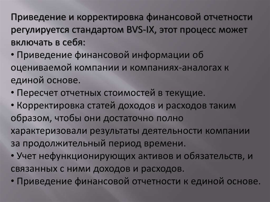 Приведение и корректировка финансовой отчетностирегулируется стандартом BVS-IX, этот процесс может
