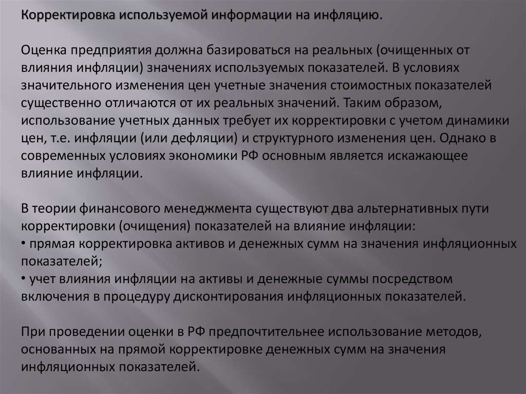 Корректировка используемой информации на инфляцию.Оценка предприятия должна базироваться на реальных (очищенных от