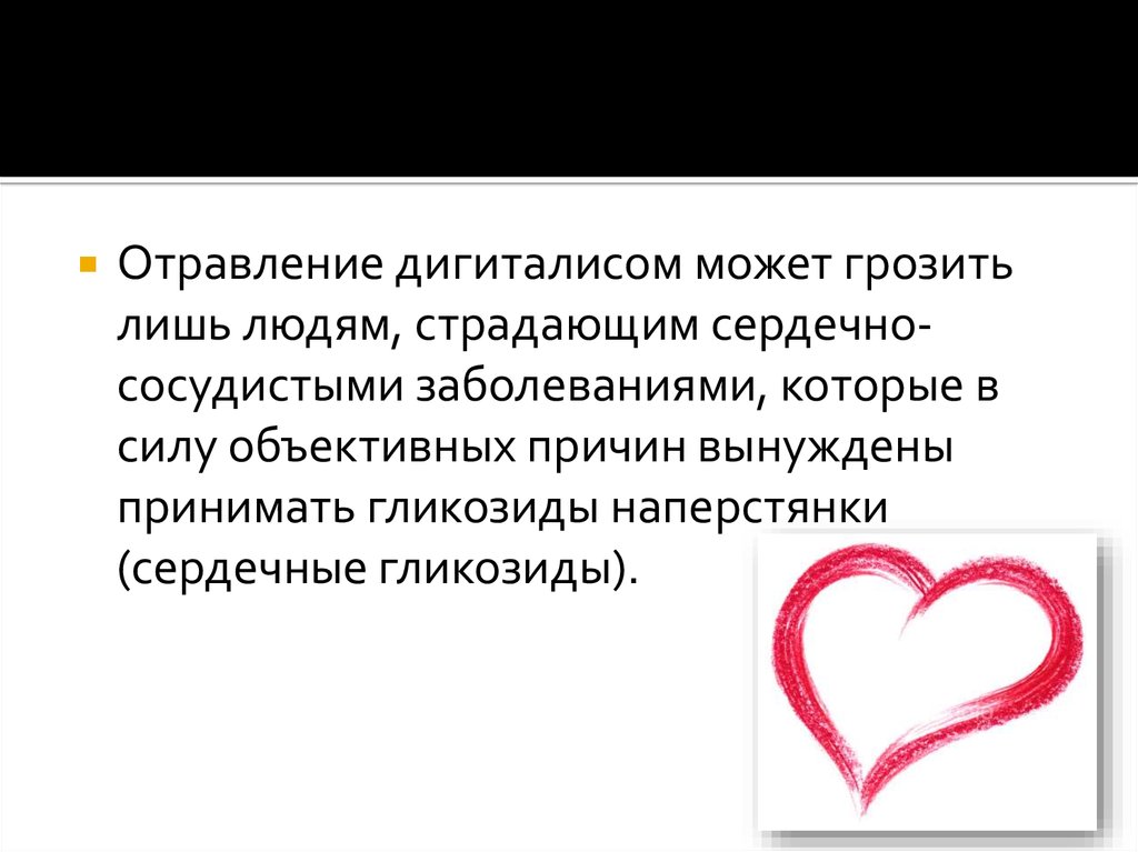 Отравление дигиталисом может грозитьлишь людям, страдающим сердечнососудистыми заболеваниями, которые в