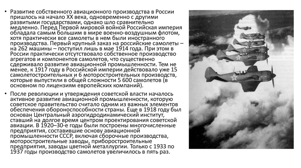 • Развитие собственного авиационного производства в Россиипришлось на начало XX века, одновременно с другими