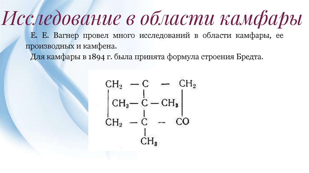Исследование в области камфарыЕ. Е. Вагнер провел много исследований в области камфары, ее
