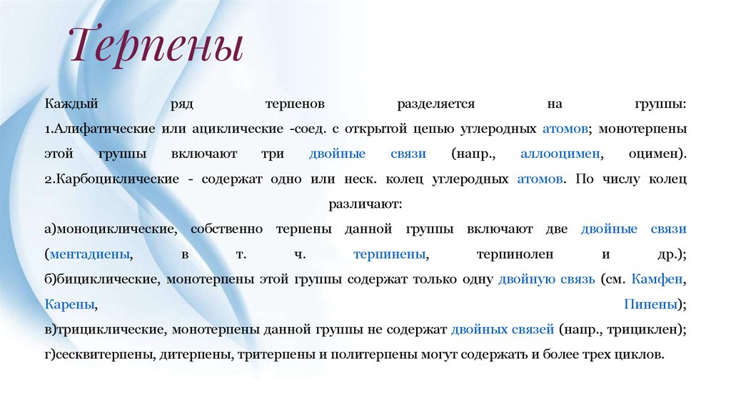 1.Алифатические или ациклические -соед. с открытой цепью углеродных атомов; монотерпены