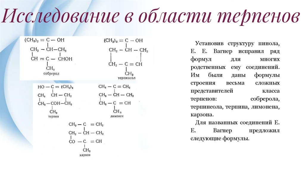 Заслуга Е. Е. Вагнера состоит и в том, что он открыл новые терпены - представители камфарной