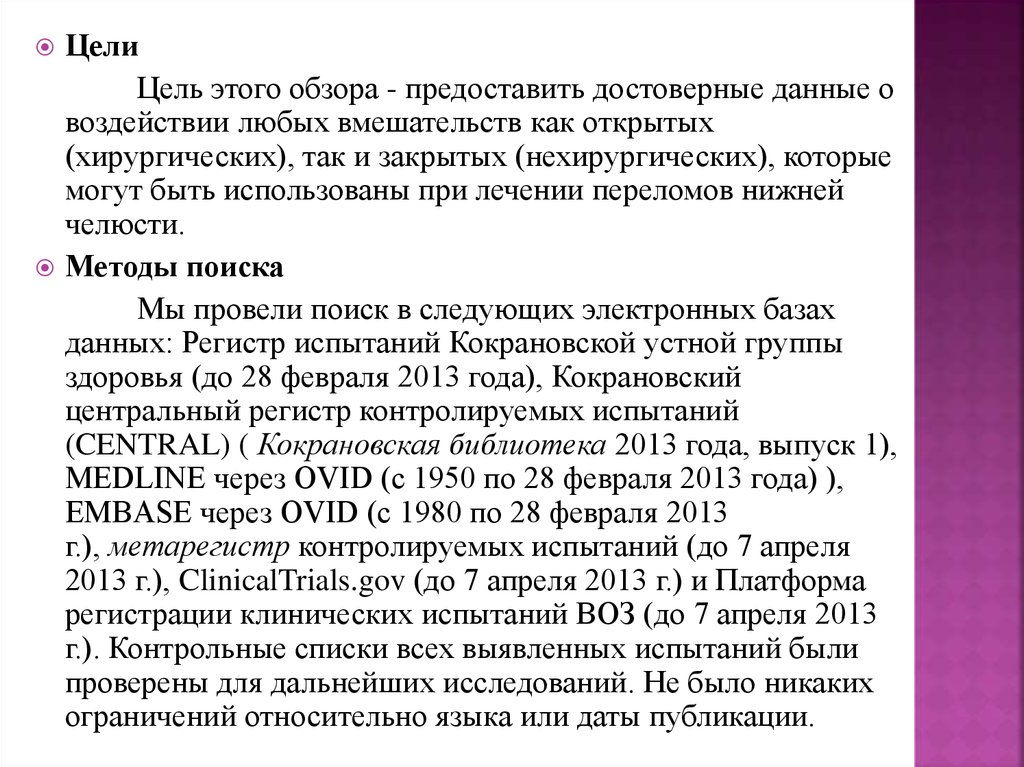 ЦелиЦель этого обзора - предоставить достоверные данные о