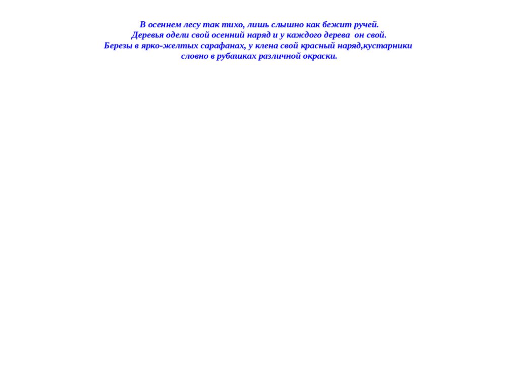 В осеннем лесу так тихо, лишь слышно как бежит ручей.Деревья одели свой осенний наряд и у каждого дерева он свой.